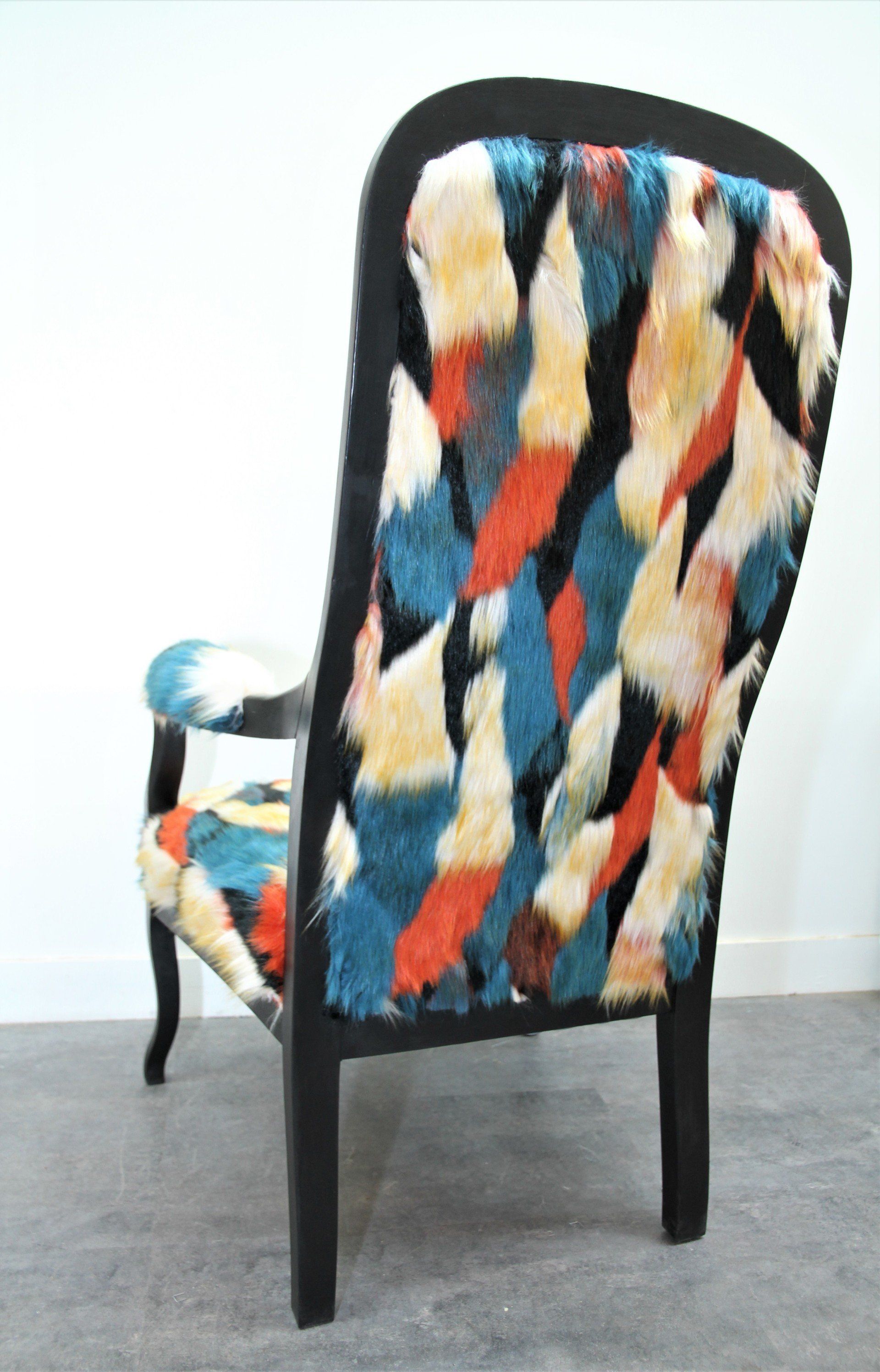 Chaise en bois refaite à neuf. Skaï noir et passe poil en skaï jaune sur le dossier. Dossier haut. Agréable dans toutes les pièces de la maison.